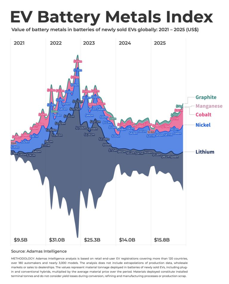 The raw material bill for the contained lithium, graphite, nickel, cobalt and manganese in the batteries of EVs sold over the course of 2025 climbed to $15.8 billion, an almost 13% gain over the year before.