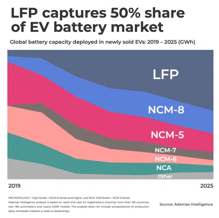 Tesla’s woes in 2025, however, further dented high-nickel NCA deployment, and apart from falling global sales, the EV pioneer’s use of LFP batteries manufactured in Germany and China now sits nearly 40% on a GWh basis.