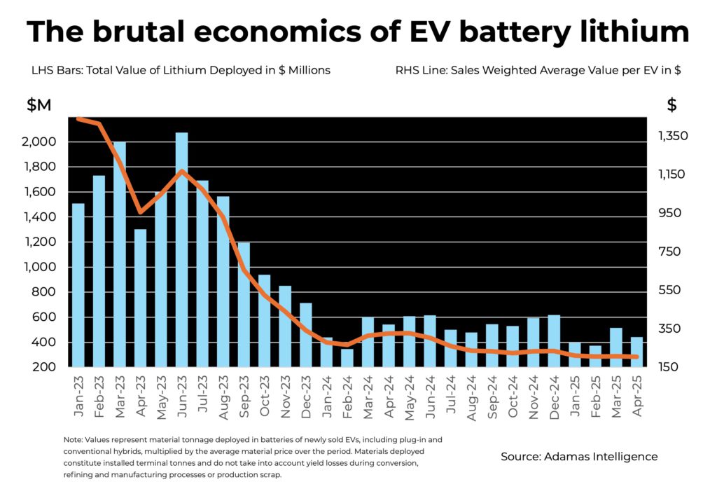 The value of terminal lithium tonnes deployed in EVs, including plug-in and conventional hybrids, sold around the world from January through May totalled $2.15 billion.