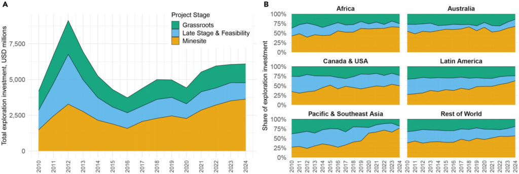Africa and Latin America retain relatively larger grassroots exploration shares, but regions both show a shift toward minesite exploration over time, increasing from 43% to 65% in Africa and from 27% to 63% in Latin America between 2010 and 2024.
