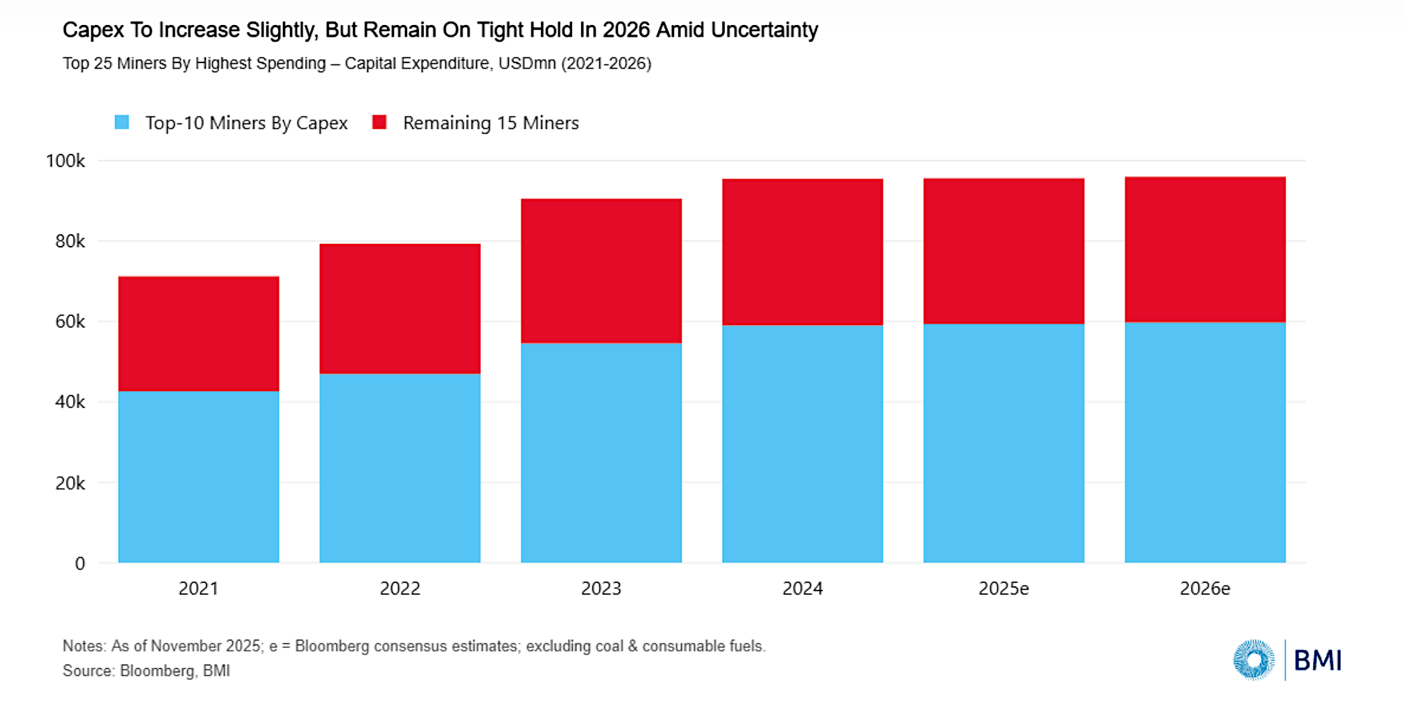 The competition for energy transition inputs will keep merger and acquisition activity robust into 2026, BMI forecasts. Miners and metals producers are set to prioritize deals that increase exposure to copper, lithium and rare earth elements. Large capital-spending projects will remain on the agenda, though staged and brownfield developments are gaining favour as firms try to manage cost pressures and policy uncertainty.