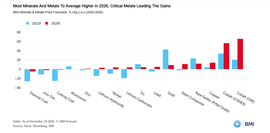 Most mineral and metal prices should edge higher in 2026 as net-zero demand, tighter supply and an intensifying global race for resources offset persistent weakness in China’s property sector, BMI, a unit of Fitch Solutions, says in a new report.