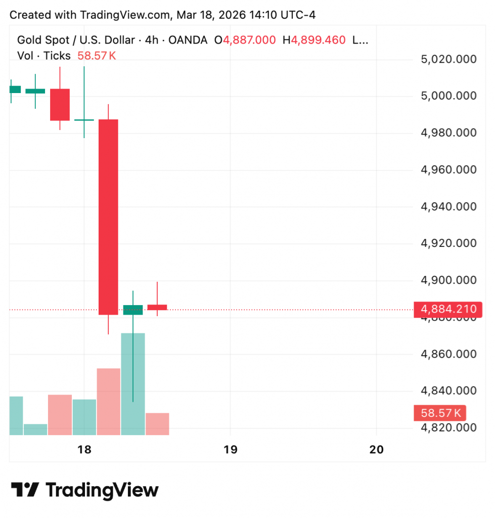 As the war drags on, inflationary concerns have gained the upper hand because supply-chain disruptions in the region continue to send energy prices higher. Since the strike on Iran late last month, gold has now fallen by over 6% after an initial surge above $5,400 — about $200 off its record high set in January.