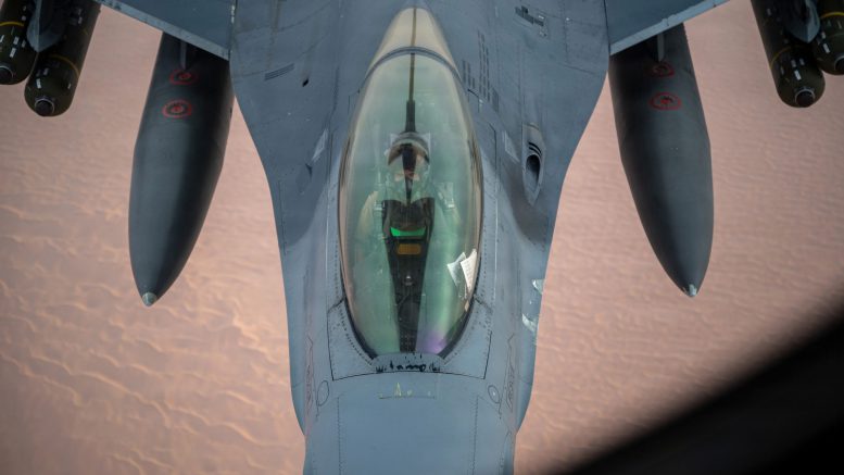 A U.S. Air Force F-16 Fighting Falcon aircraft refuels from a KC-135 Stratotanker aircraft during Operation Epic Fury, April 2, 2026. (U.S. Air Force photo)