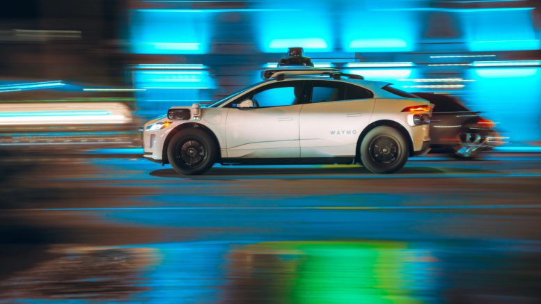 Google's Alphabet Waymo driverless self driving taxi cab driving along city street traffic at night. Credit: Adobe Stock Photo by logoboom