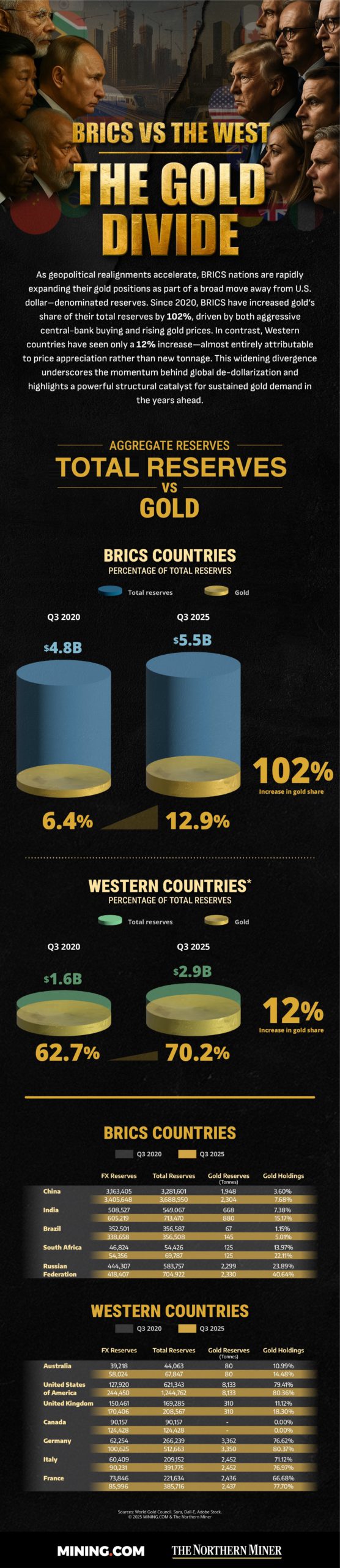 As geopolitical realignments accelerate, BRICS nations are rapidly expanding their gold holdings as part of a broad shift away from US-dollar-denominated reserves. Since 2020, BRICS countries have increased gold’s share of their total reserves by 102%, driven by both aggressive central-bank buying and rising metal prices. In contrast, Western nations have seen only a 12% increase – growth almost entirely attributable to price appreciation rather than new tonnage.