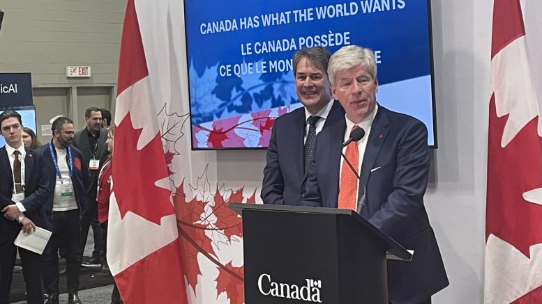 Federal Natural Resources Minister Tim Hodgson addresses PDAC in Toronto on Tuesday with ministry Parliamentary Secretary Claude Guay, a Montreal MP. Credit: Colin McClelland / The Northern Miner