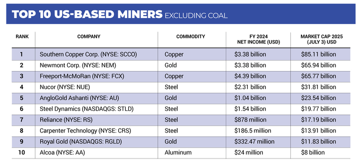 Global miners Southern Copper (NYSE: SCCO), Freeport-McMoRan (NYSE: FCX) and Newmont (NYSE: NEM) once again topped their U.S. peers for market capitalization and earnings while several steelmakers had a down year.
