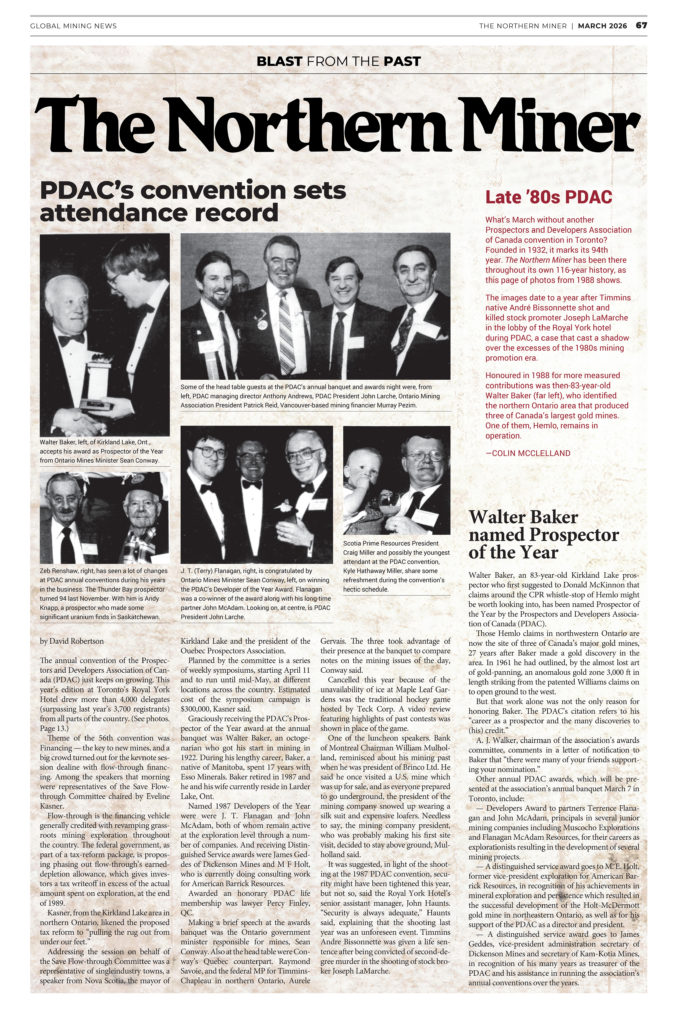 Even so, PDAC kept the spotlight on discovery, naming Kirkland Lake prospector Walter Baker Prospector of the Year for work that helped point the way to Ontario’s Hemlo camp.